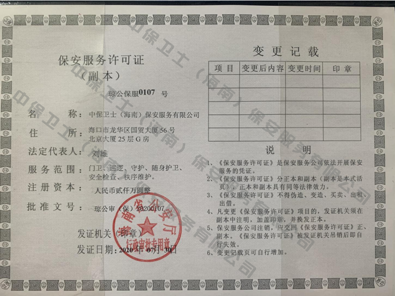 半岛手机站·网站在线官网-半岛(中国) 是经海南省公安厅批准,依法持有《保安服务许可证》,提供保安服务、门卫、巡逻、守护、区域秩序维护、随身护卫、安全检查的专业化保安服务公司。